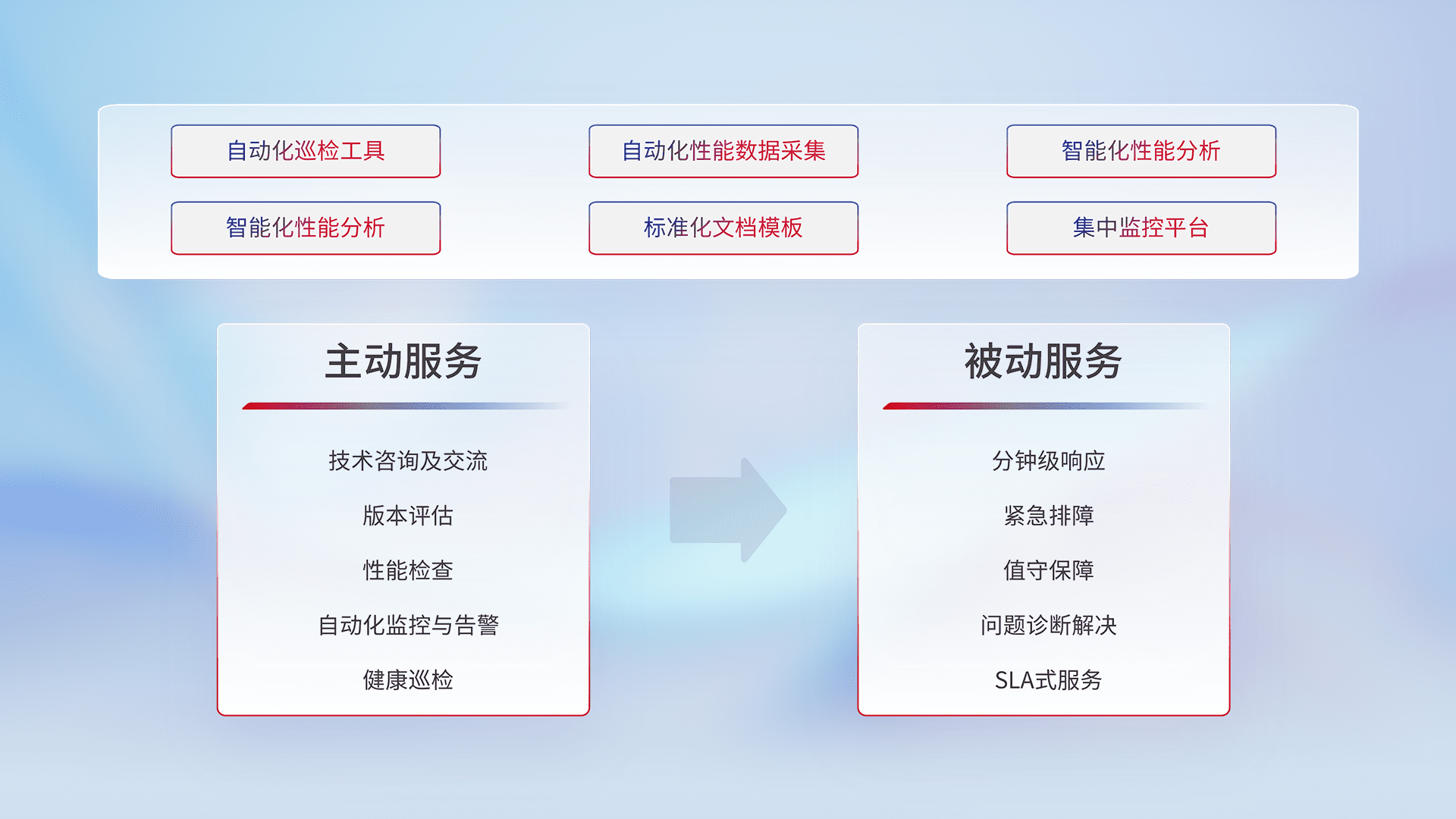 智能化工具和标准化文档,,保障服务质量,,,,提供主动服务(包含技术咨询、、版本评估、、、性能检查、、、、自动化监控与告警、、健康巡检)和被动服务包含(分钟级响应、、紧急排障、、、、值守保障、、、问题诊断解决、、、SLA服务)。。。。